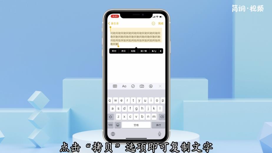 苹果复制文字的方法在任何应用中都是一样的。以备忘录为例。具体操作步骤如下: