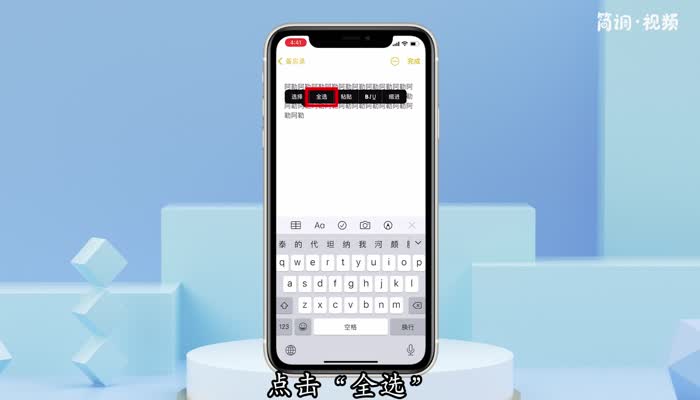 3.长时间按住光标,会出现一个小的弹出窗口。点击弹出窗口中的“选择”或“全选”。这里以全选为例,点击“全选”;