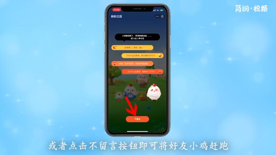 4.选项出现在页面上。可以选择给朋友留言,也可以点击“不留言”按钮赶走朋友的鸡。