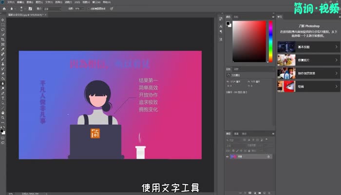 1.打开图层,使用文字工具,先给图层添加文字;