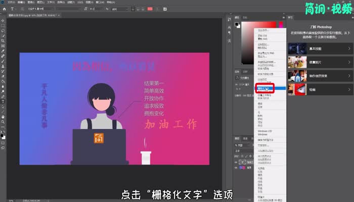 3.右键点击文字图层,点击“光栅文字”选项;