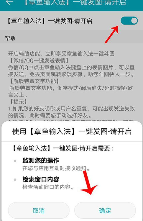 然后打开章鱼输入法辅助按钮,点击确定,返回微信对话框。