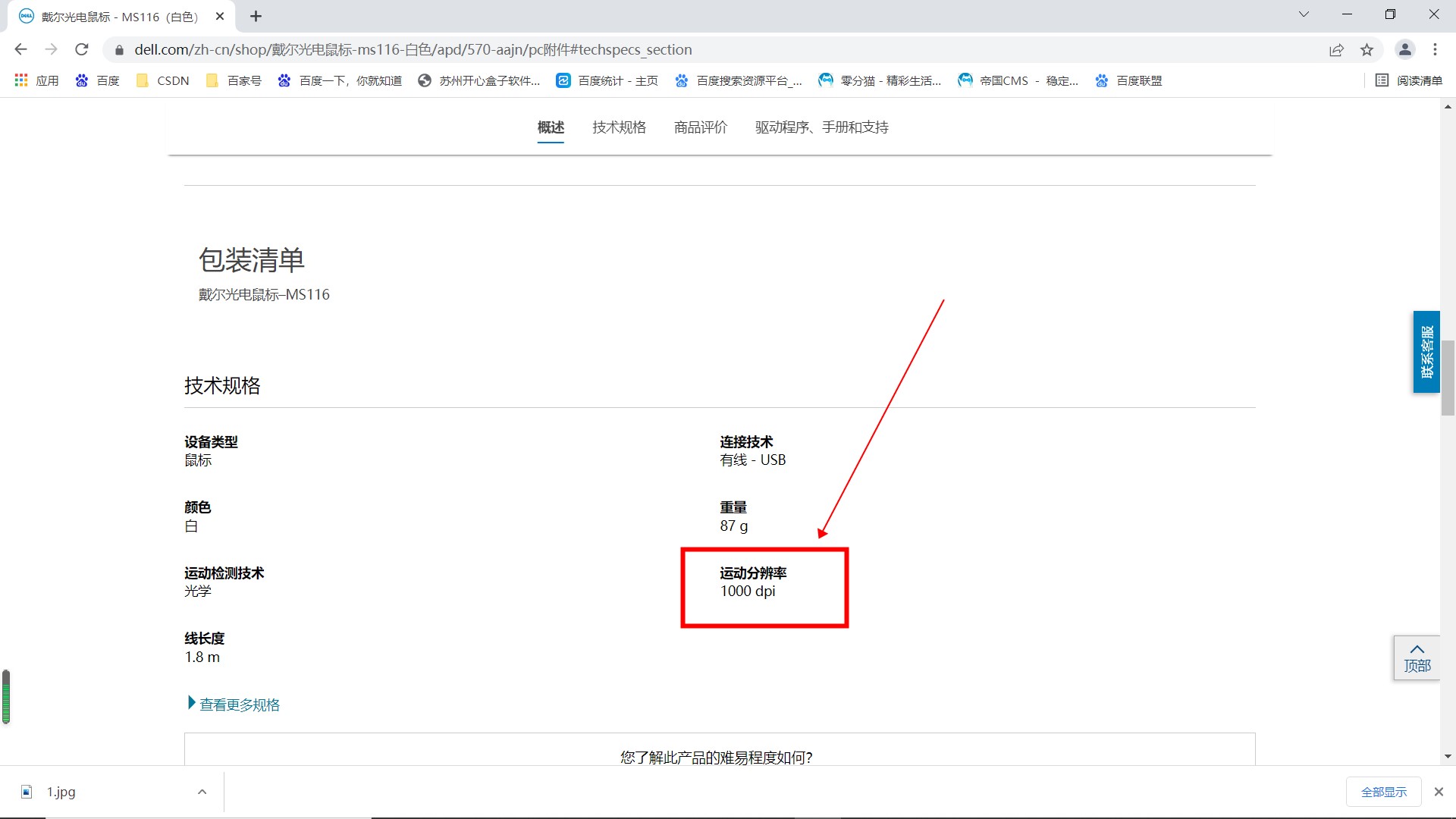 搜索“戴尔MS116DPI”查找鼠标的DPI。