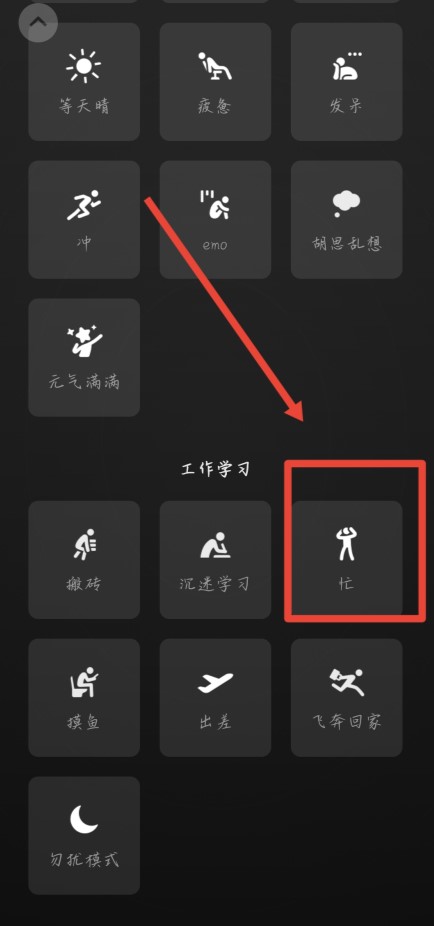 在“学习与工作”中选择“忙碌”状态,点击进入。