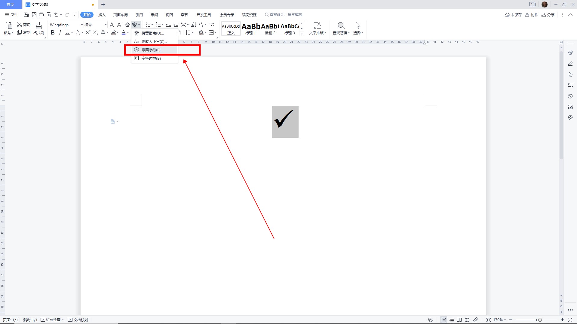 在文本的下方菜单中,单击“带圆圈的字符”。
