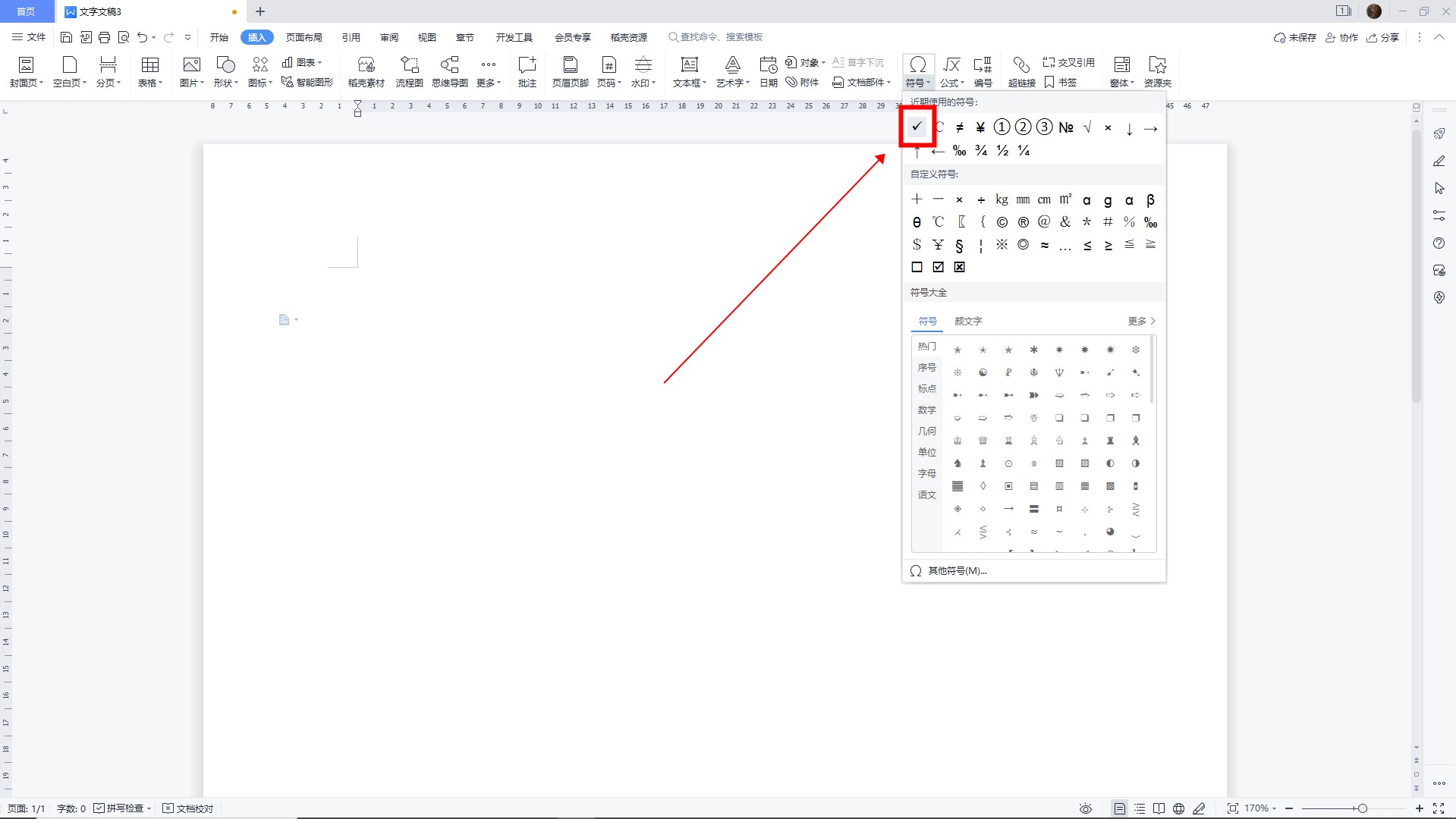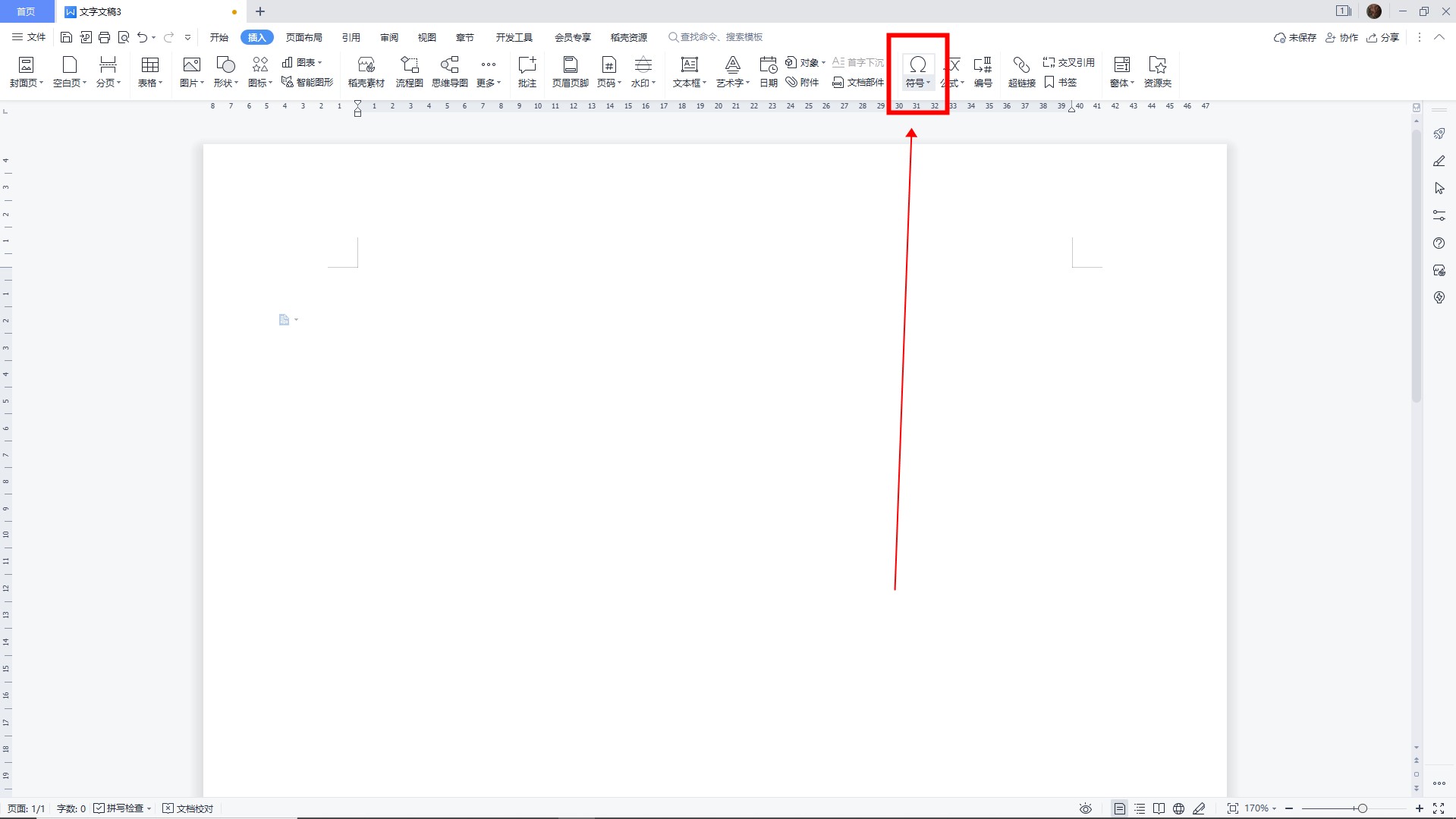 首先,打开一个Word文档,点击顶部插页下的“符号”。
