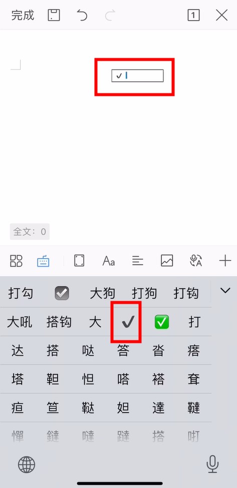 在手机WPS中打开Word,勾选复选框,点击拉起手机键盘。