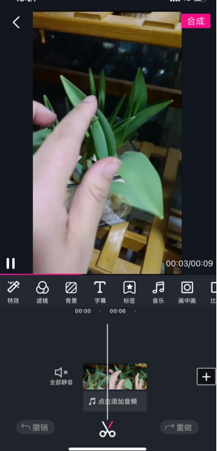素材导入后,选择视频大小,进入编辑页面,编辑,拼接,分割,变速,操作特效,滤镜,背景,字幕,音乐等功能。根据需要。