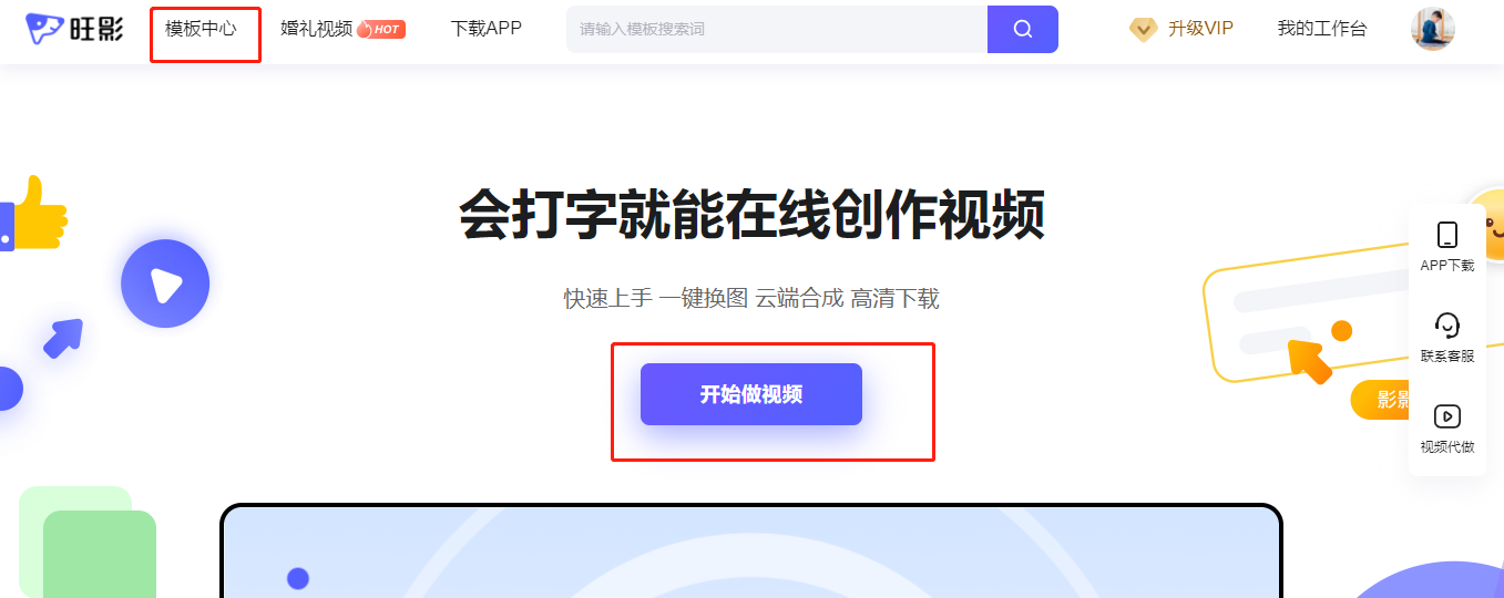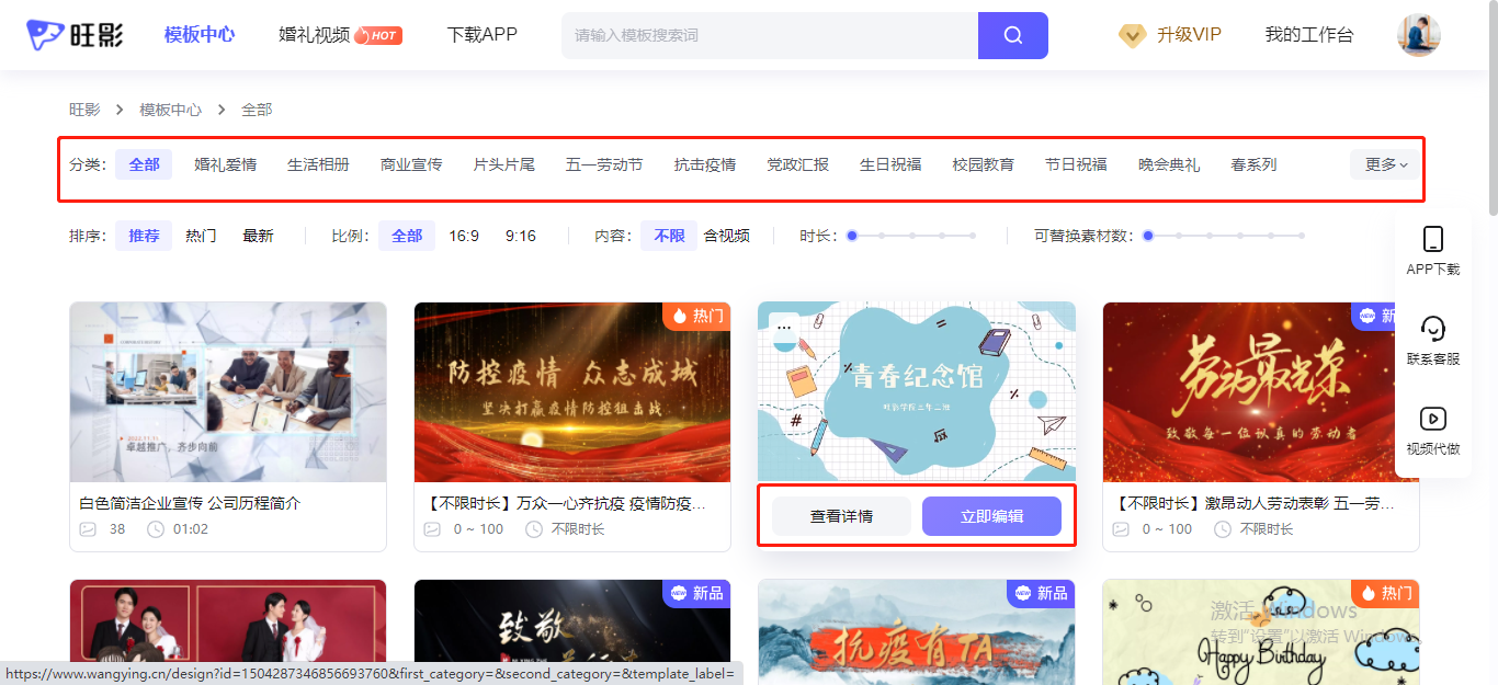 进入王赢官网,点击【开始视频】或直接进入【模板中心】,根据分类找到需要的视频模板。