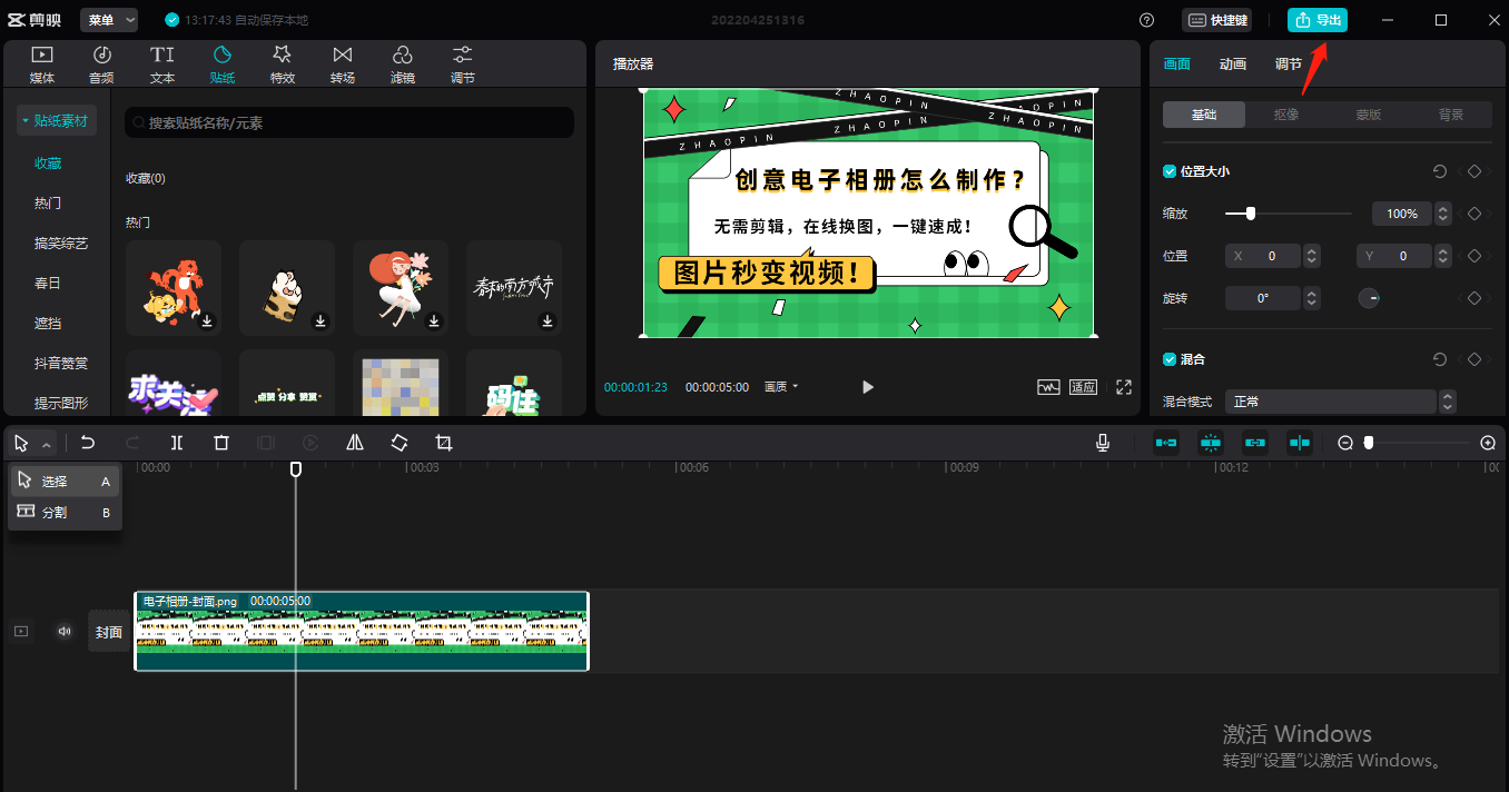 完成后,点击右上角的【合成】,设置好分辨率和帧率后,就可以直接合成视频保存到本地了。