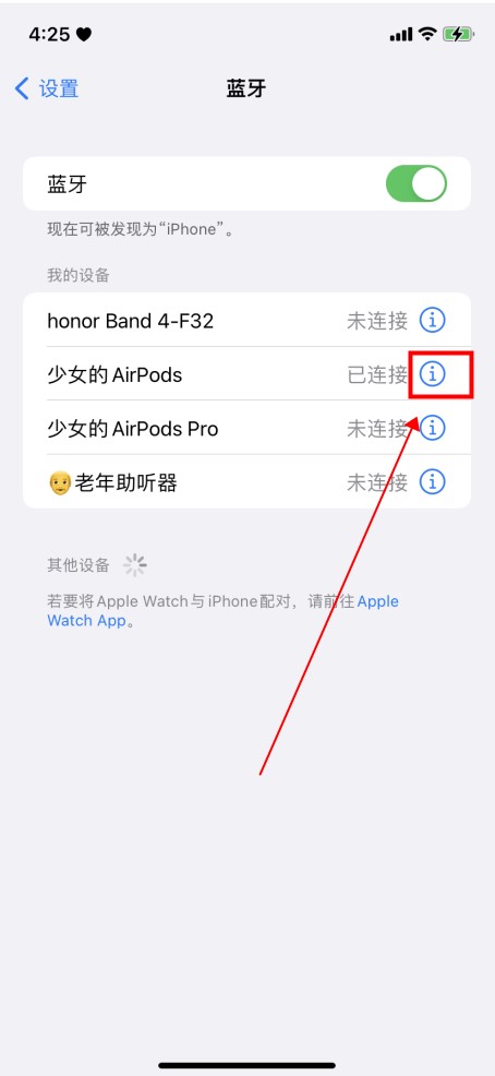 进入蓝牙界面,点击连接的蓝牙耳机后面的蓝色符号。