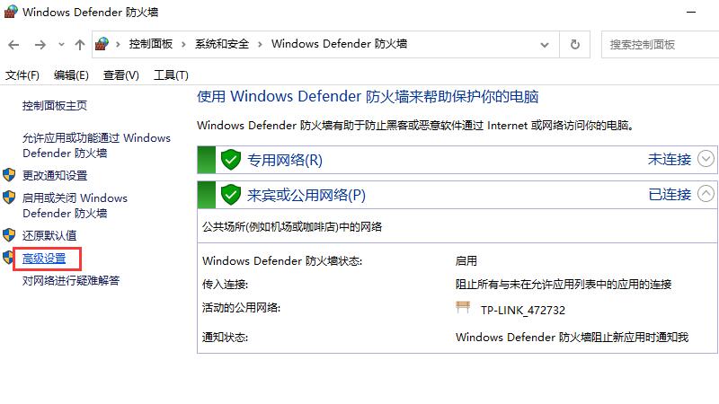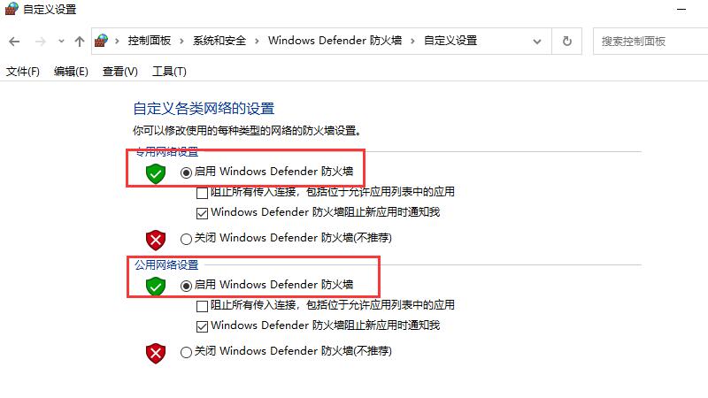 在“专用网络设置”和“公共网络设置”中点按“启用Windows Defender防火墙”以打开防火墙。