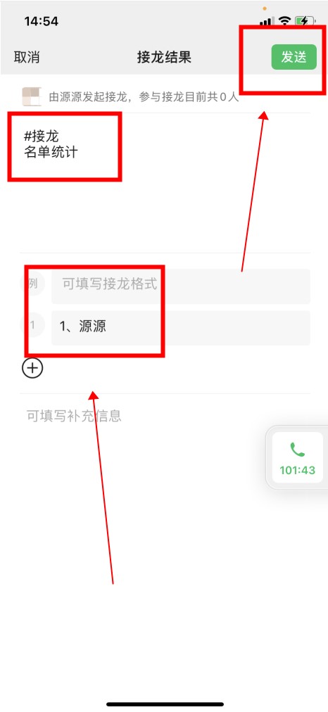 在接龙表单中,输入接龙内容、格式等。并点击“发送”。