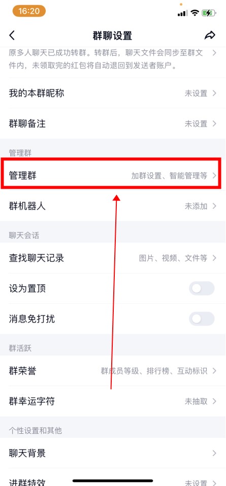 进入群聊设置,点击“管理群聊”。