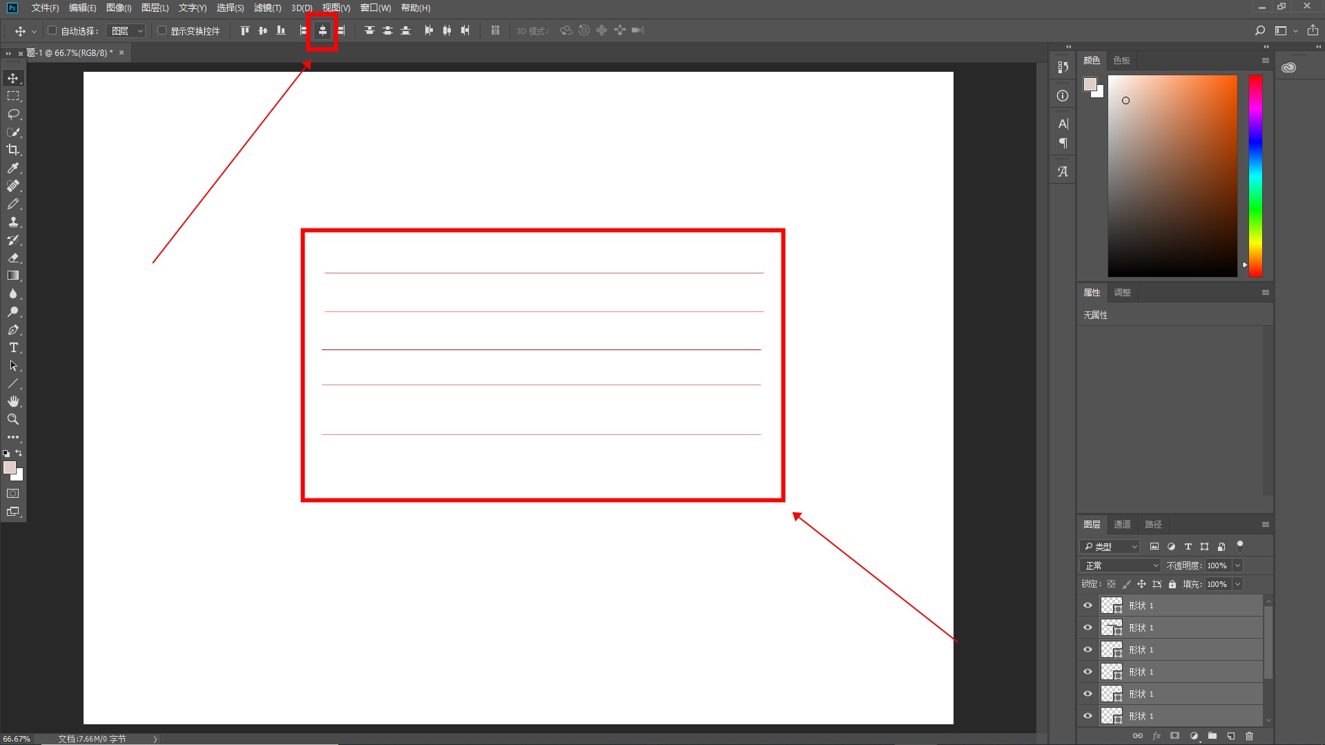 按住Ctrl选中所有水平线,点击上面的“水平居中对齐”。
