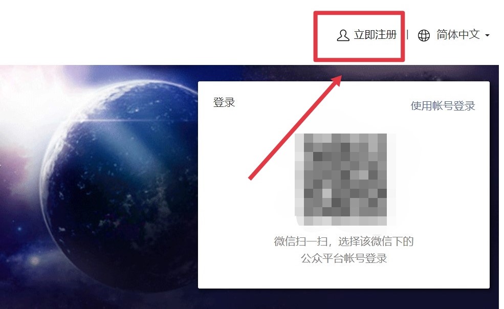 在微信公众平台,点击右上方的“立即注册”。