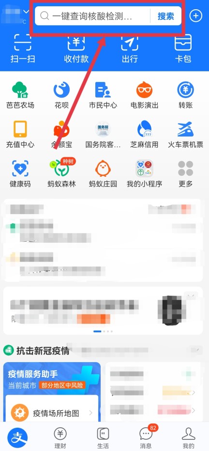 打开支付宝的首页,点击顶部的搜索栏。
