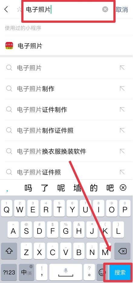 在搜索栏输入一张电子照片,点击右下角手机键盘上的“搜索”。