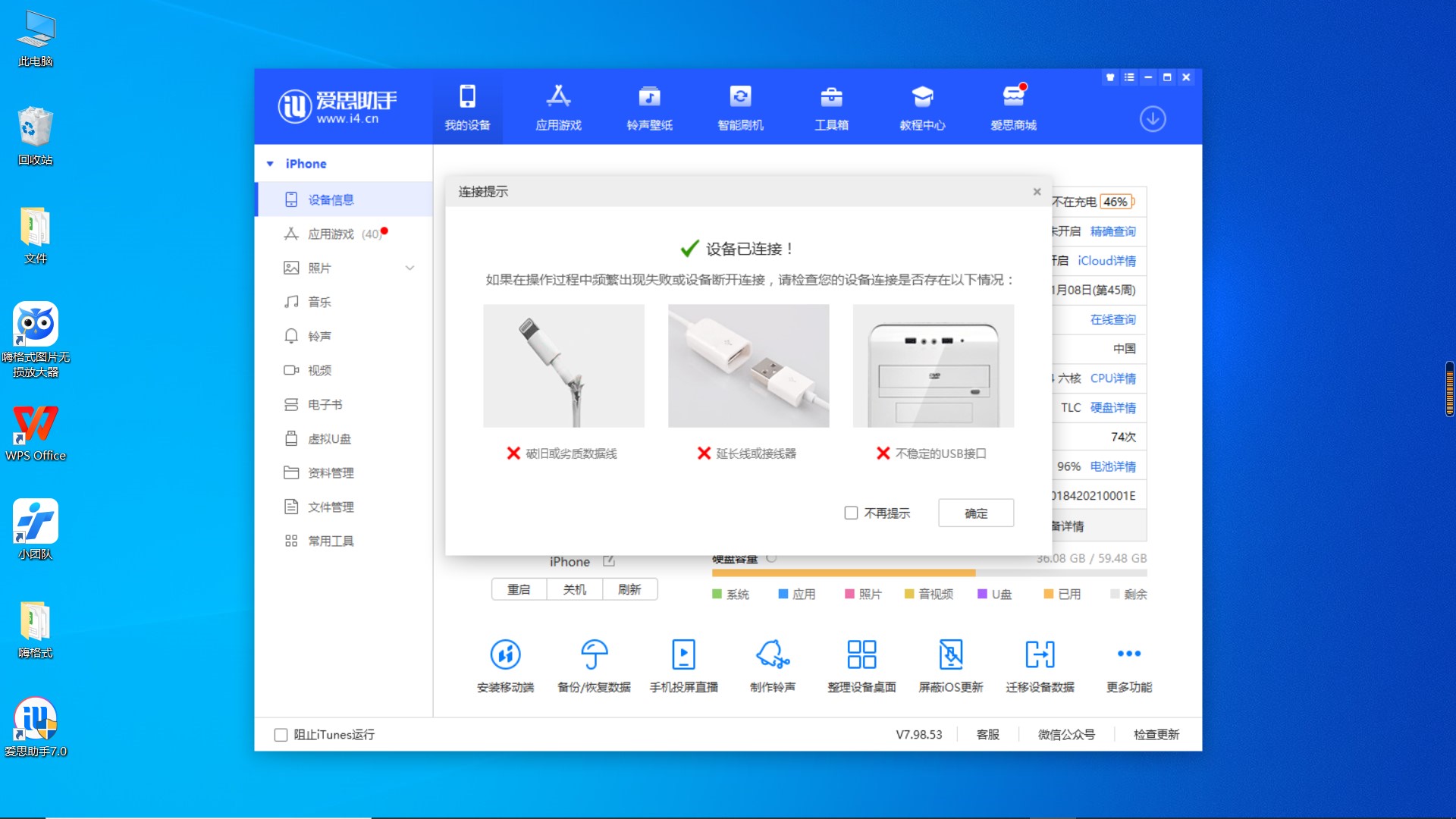 打开爱思助手,用数据线连接手机和电脑。
