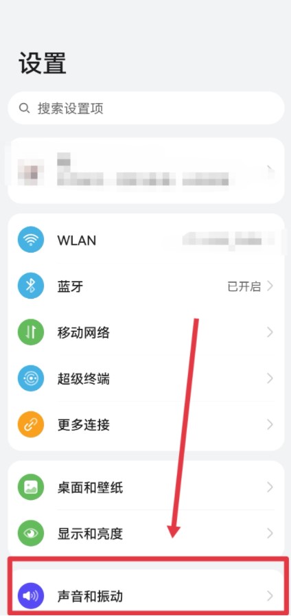 在手机的“设置”页面上,单击下面的“声音和振动”。