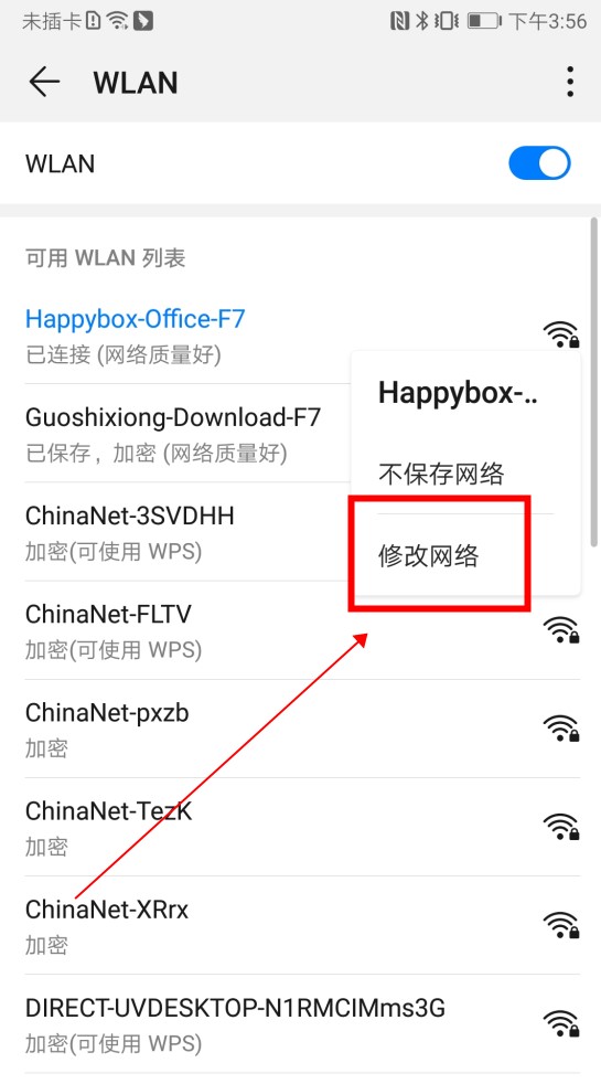 然后按住连接的WiFi,点击弹出的“修改网络”。