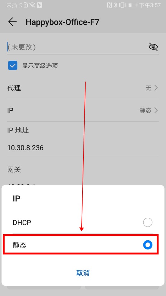 在WiFi设置界面,勾选“显示高级选项”,点击“IP”。