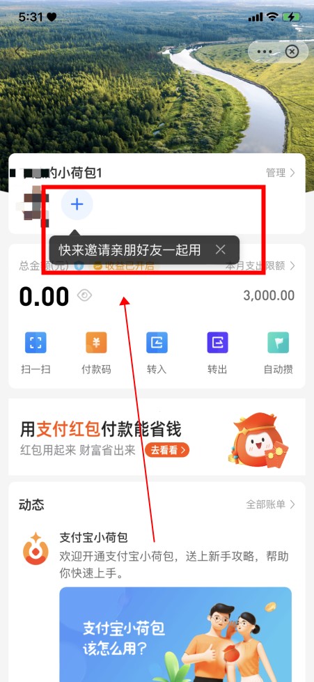 支付宝钱包新建时,点击“”邀请亲朋好友一起转账省钱。