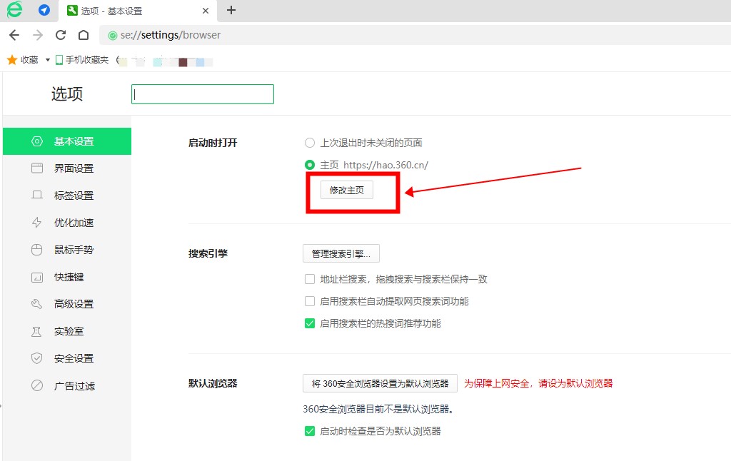 进入浏览器设置界面,点击基础设置第一项中的“修改主页”。
