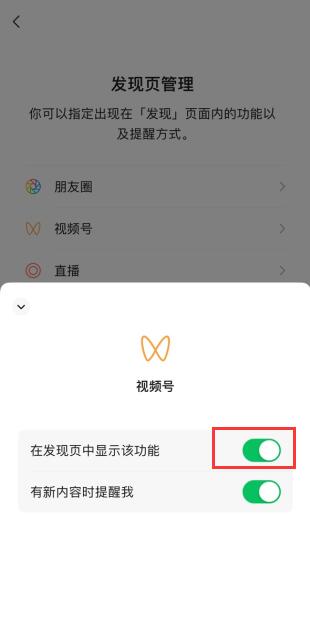 在弹出窗口中,滑动“在发现页面中显示此功能”即可。