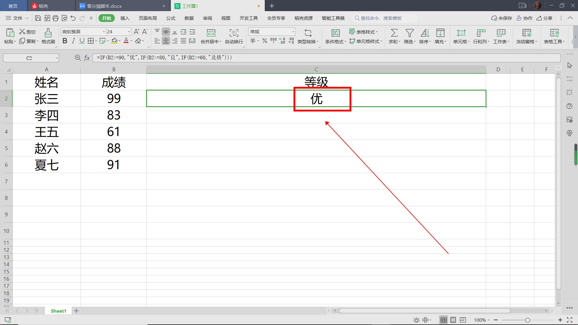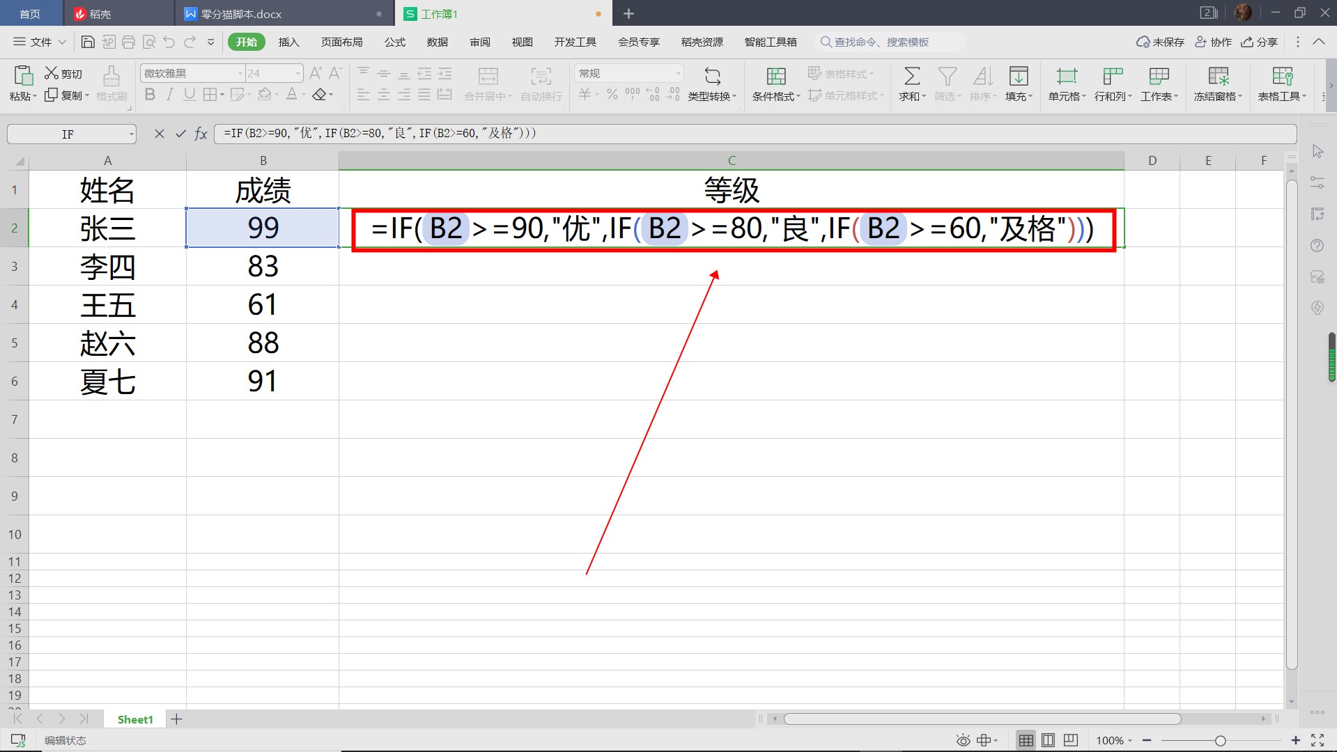 然后进入函数:=IF(B2=90,'优秀',IF(B2=80,'好',IF(B2=60,'及格'))。