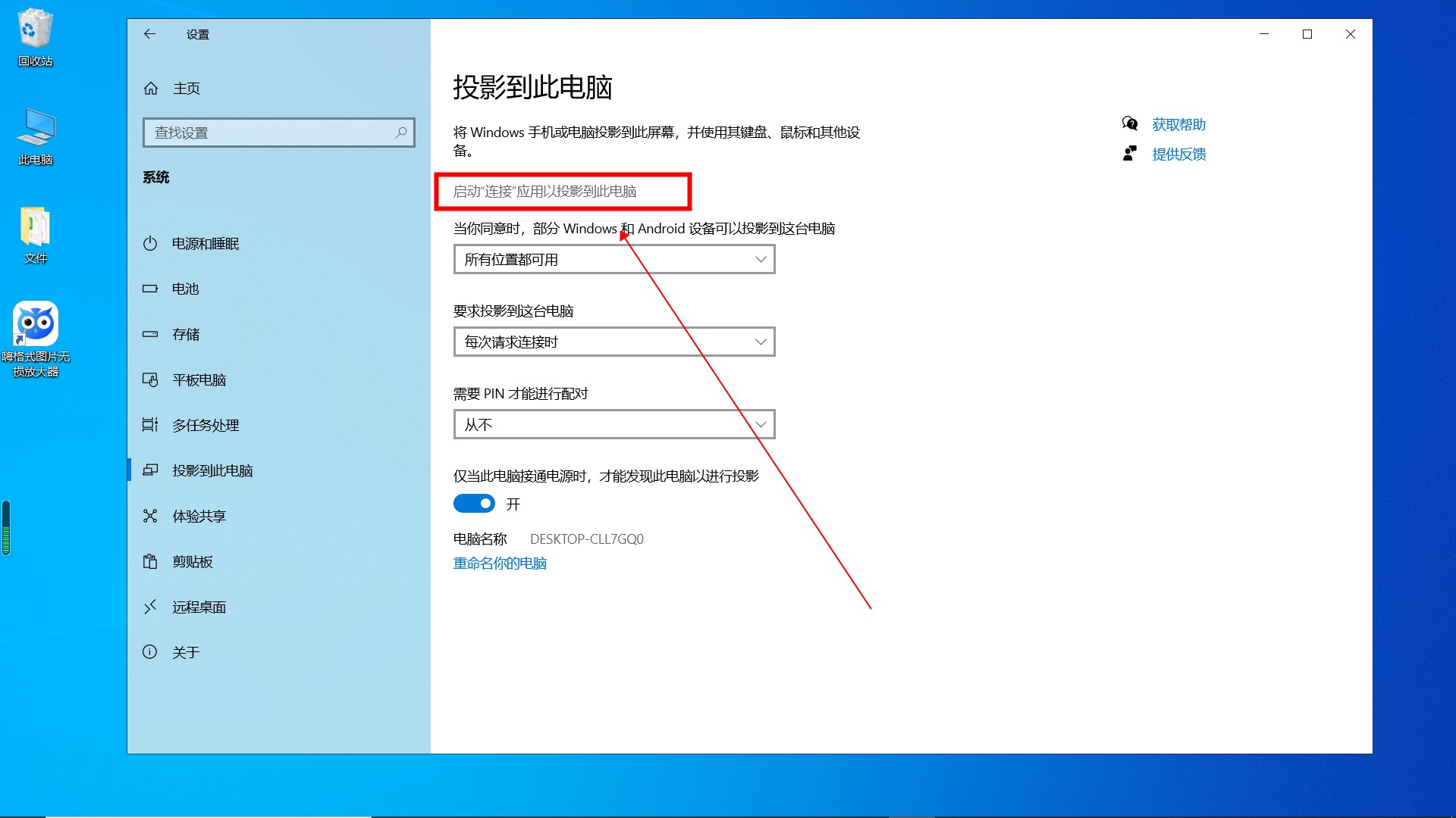 在电脑系统中,点击左侧的“投影到这台电脑”。