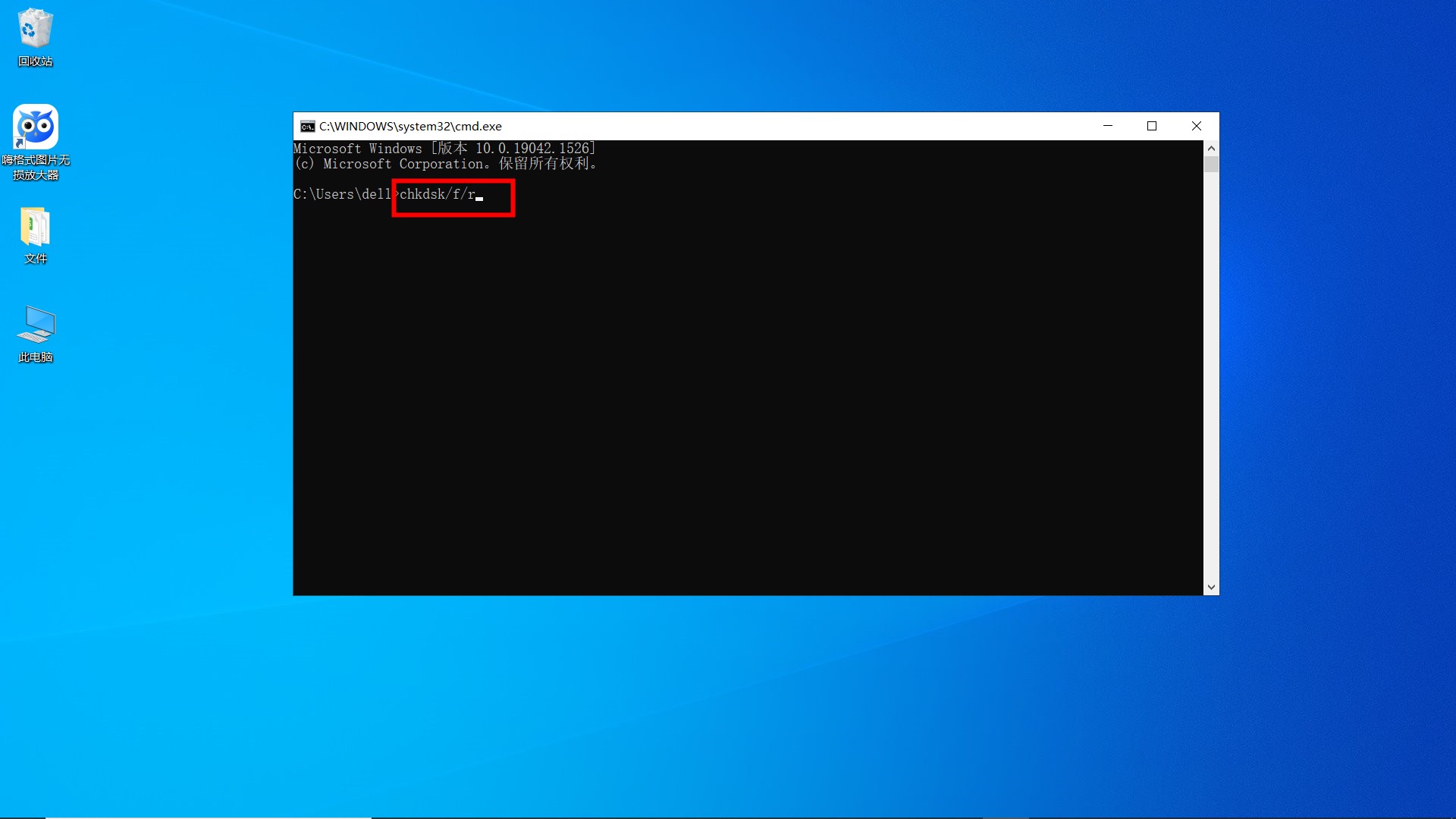 4.进入命令提示符窗口,输入chkdsk/f/r,然后回车。