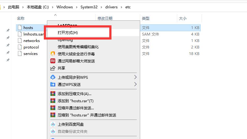 右键单击hosts文件,然后单击菜单中的“打开方式”选项。