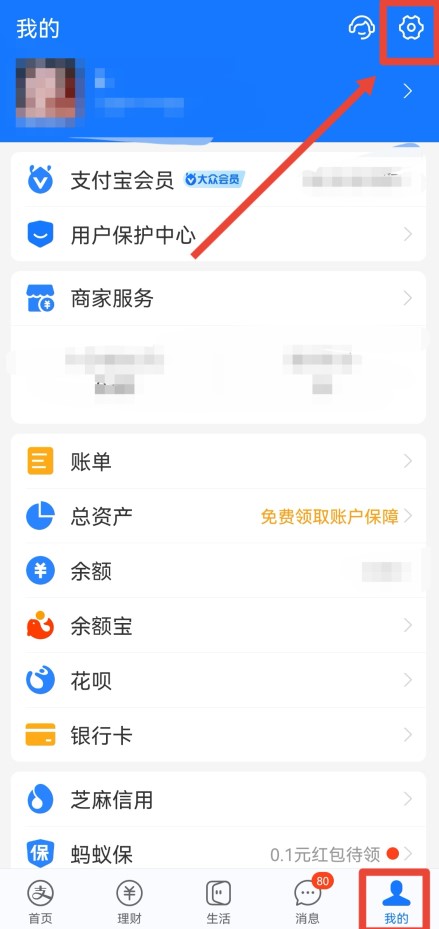 打开支付宝里的“我的”页面,点击右上角的设置图标。