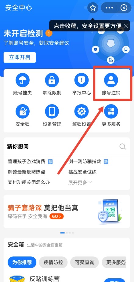 在“安全中心”页面上,单击右侧的“帐户注销”选项。