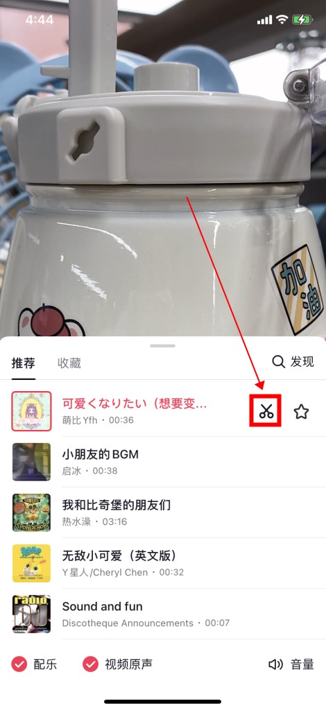然后选择一段音乐,点击后面的小剪刀就可以编辑音频了。