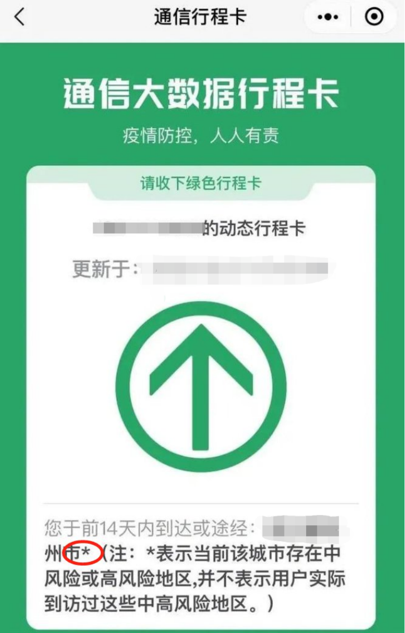 行程代码带*(星号):表示在过去14天内访问过的城市中存在中高风险区域,但不代表你实际访问过这些中高风险区域。仅作为包含中高风险区城市的提示标志,方便管理者查看,与个人健康状况无关。