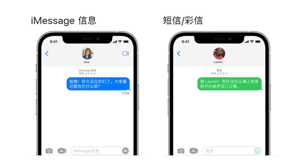 编辑内容并点击发送后,内容显示为蓝色文本气泡,表示以iMessage的形式发送。内容显示为绿色文字气泡,表示是普通短信发送。