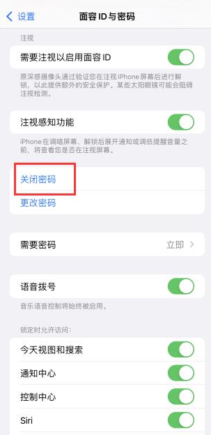最后在face ID和密码页面点击“关闭密码”解锁锁屏密码。