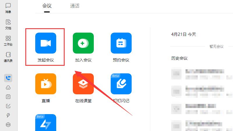 打开钉钉界面,点击左侧菜单中的“会议”选项。