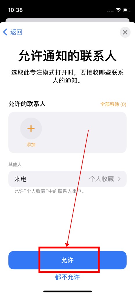 然后,设置允许通知的联系人,点击“允许”或“无”。