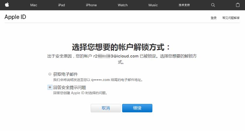 解锁方式包括邮件解锁和安全问答解锁。以“回答安全问题”为例,点击继续。