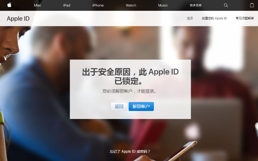 登录后会提示“出于安全考虑,此Apple ID已被锁定”,点击“解锁账户”。