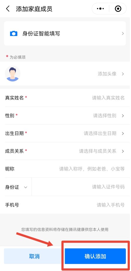输入要添加的家庭成员信息,点击右下角的“确认添加”。