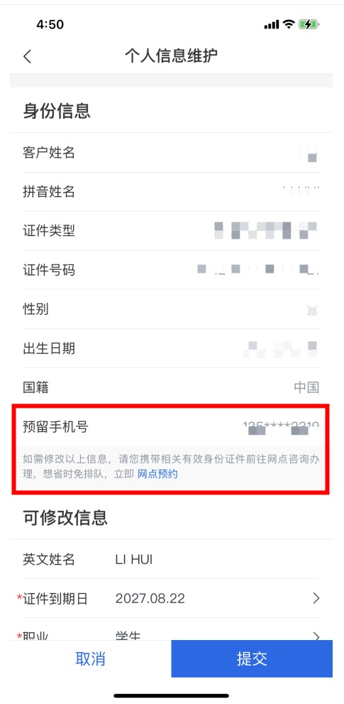 这里可以看到,预留的手机号是不能修改的。可以点击网点预约。预约后可携带相关资料更换手机号码。