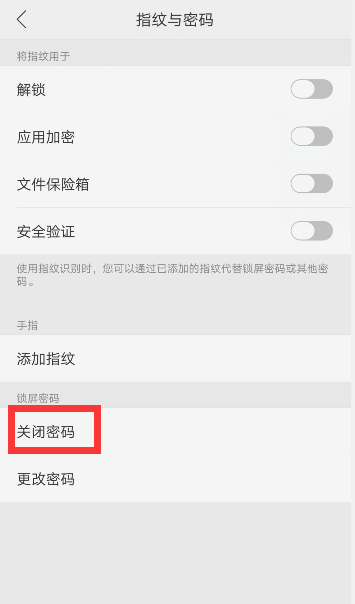 手机进入恢复模式还有一个密码,就是手机的锁屏密码。进入恢复模式前只需关闭锁屏密码,打开手机设置点击“指纹和密码”选项,进入后点击“密码关闭”选项,画出设定的密码图案即可成功关闭。