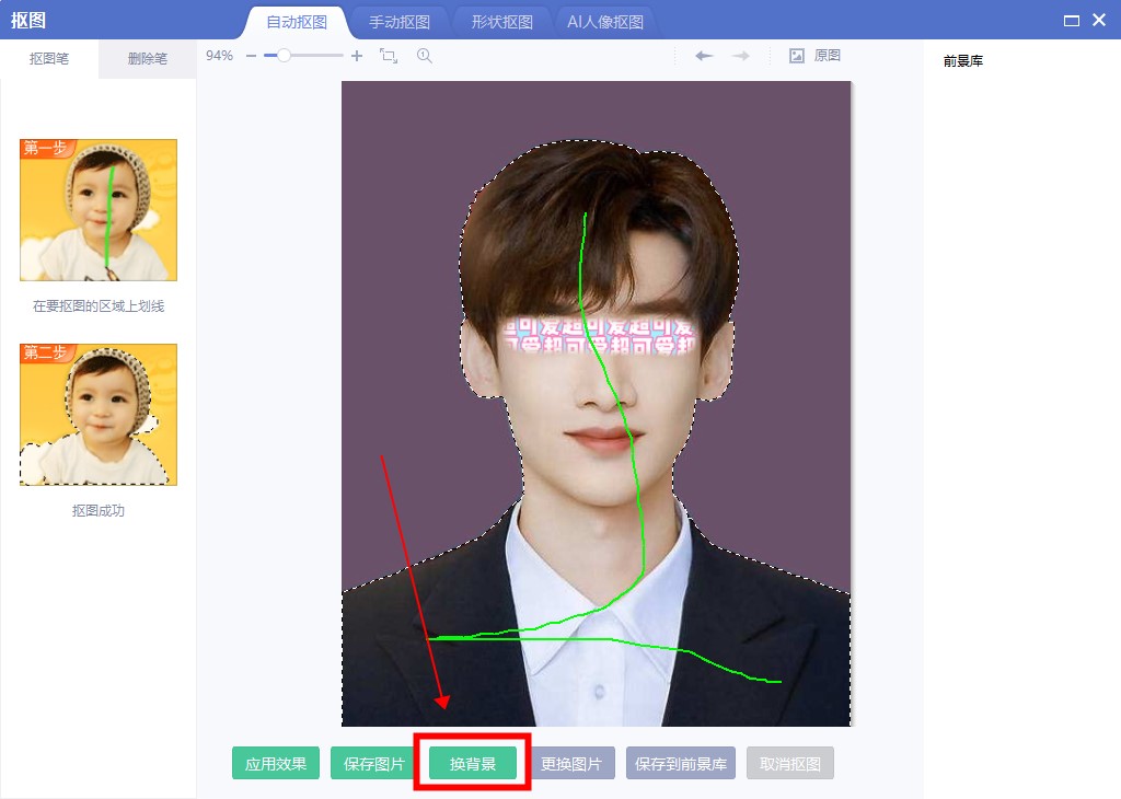 然后在要抠图的区域上画一条线,直到抠图内容被选中,点击“更改背景”。