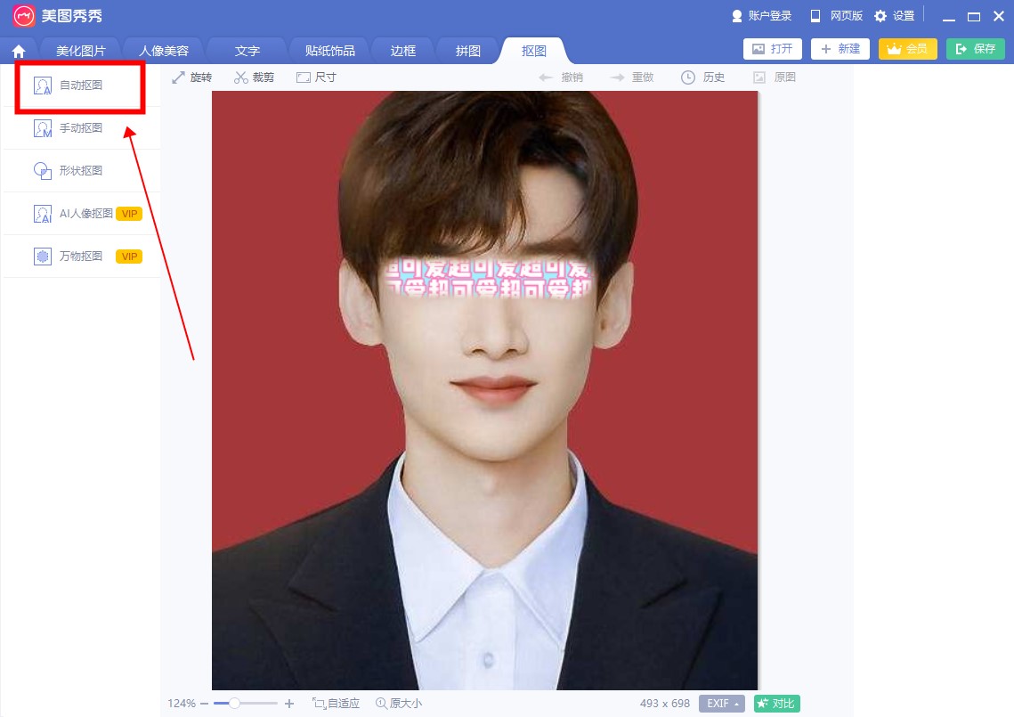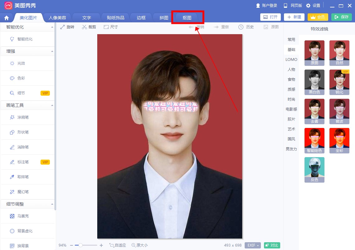 然后打开要处理的证件照,点击顶部的“抠图”选项。