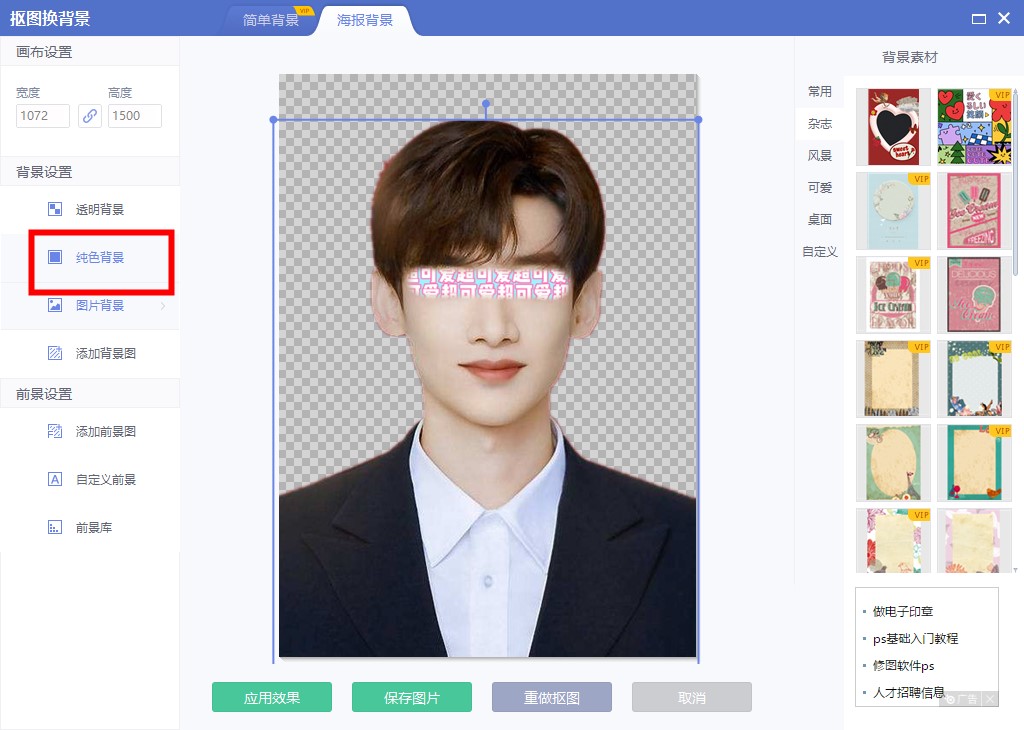 然后调整前景图片的大小,点击左边的“纯色背景”。