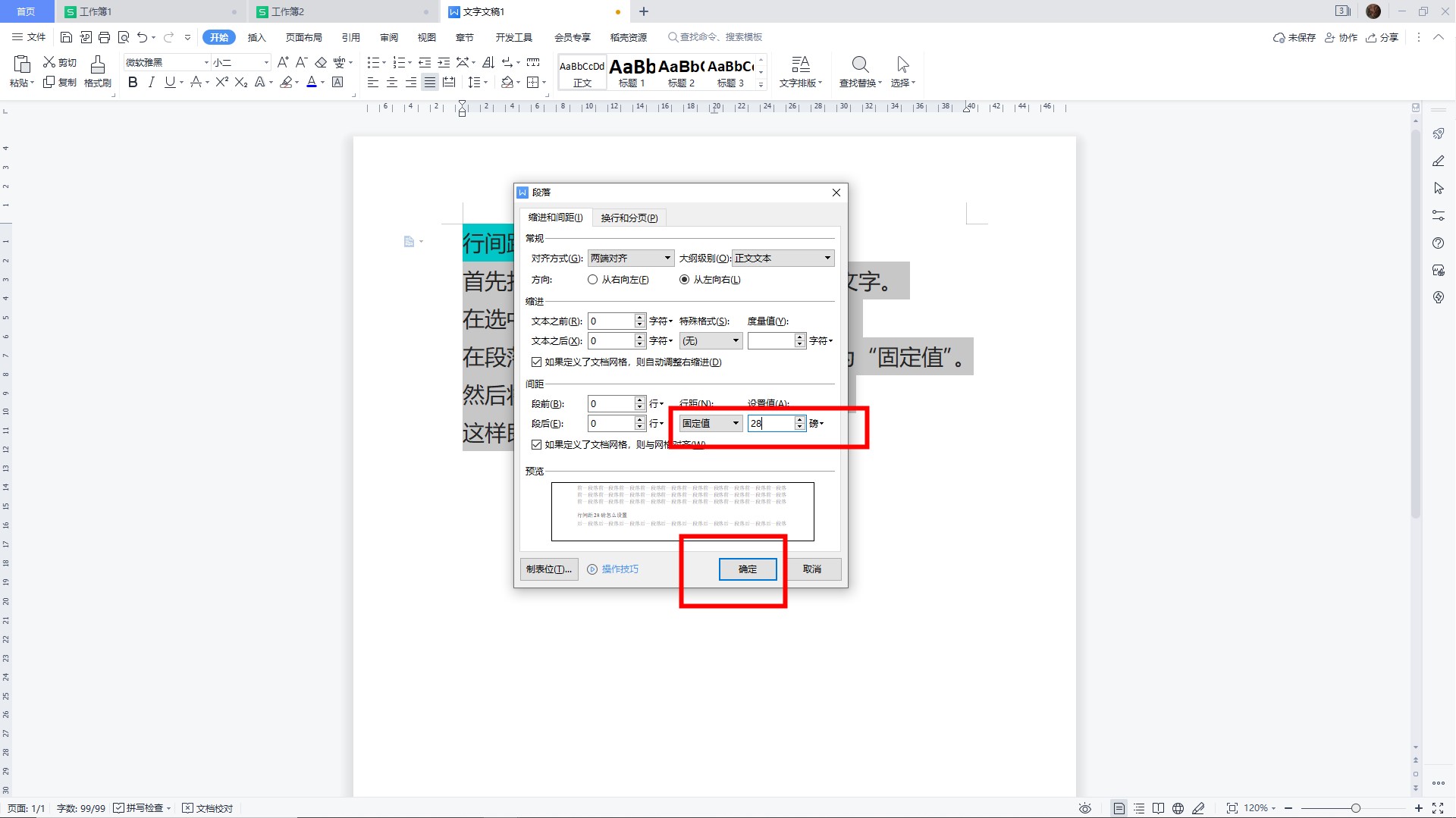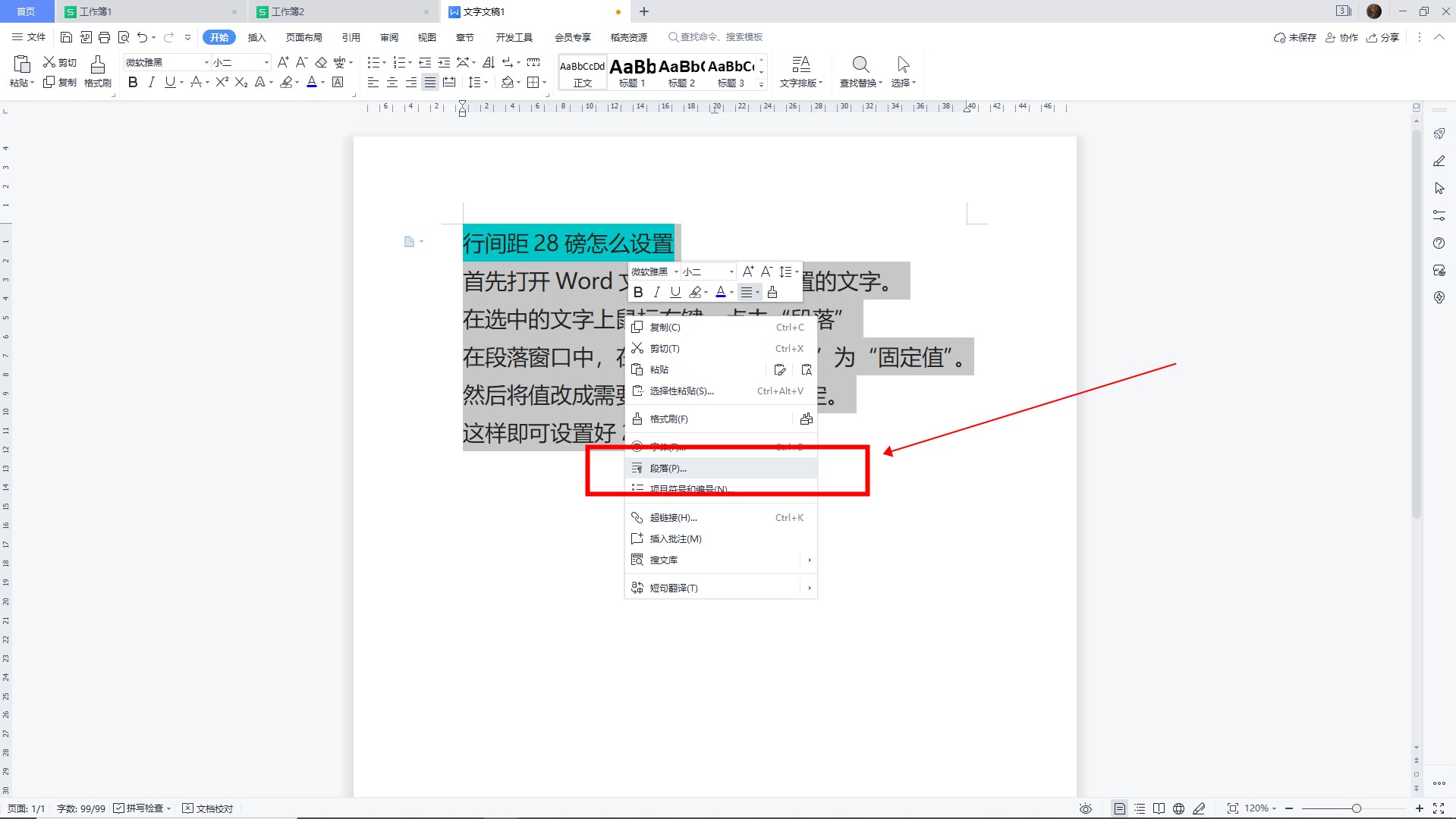 可以在文本段落中设置28磅的行距。以WPS 11.1.0.11365为例,分为以下五个步骤: